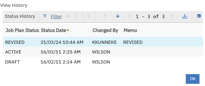 Each time the JP has a status change, there is a corresponding entry in the Job Plan Status History table (PLUSCJPSTATUS). Therefore, the oldest date with a status of DRAFT is the initial creation date.