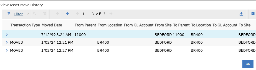 When you create an asset and save, a record is added to the Asset Move History table (ASSETTRANS). This represents the initial creation date is where there is no Transaction Type.