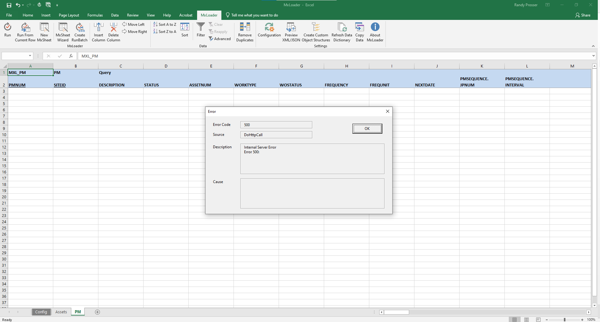 Is anyone else getting an error when trying to Query the PM loader sheet? I can query and load from the Assets sheet and the Item sheet. I just get the error on the PM sheet. Thanks for any help or advice.