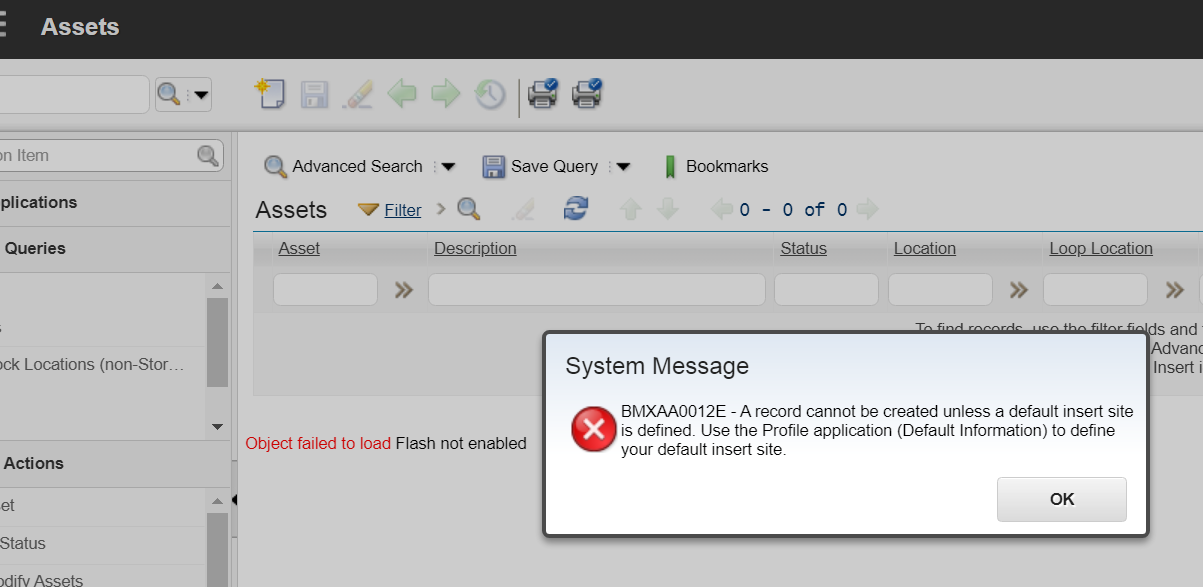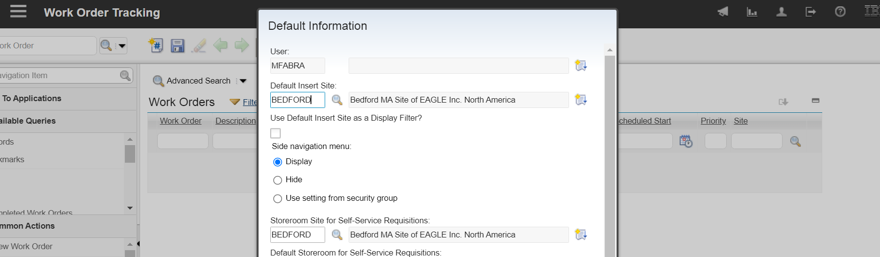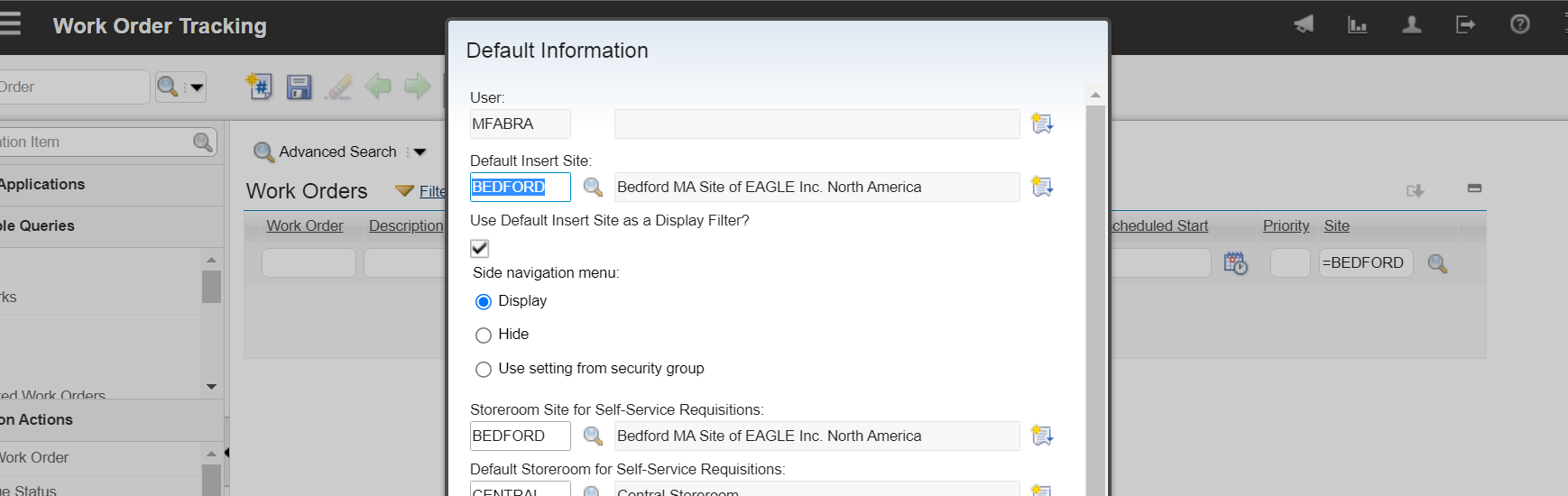 What this does is, when you enter an application that uses SITE, it defines the search value or it does not define it. Without defining this check, it will search all records for all sites where the user has access (in the case of the defined user, this will be BEDFORD and NASHUA).