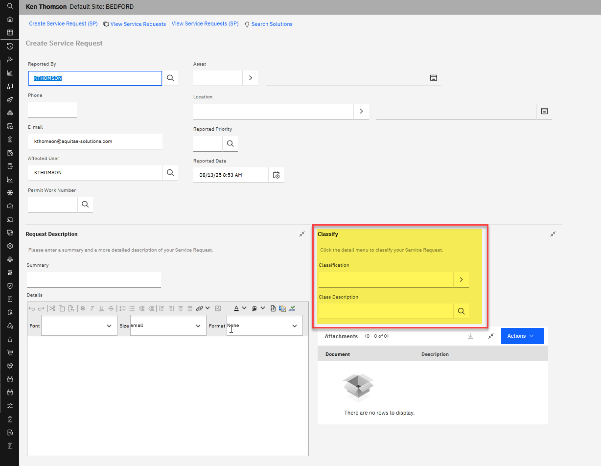 Creating a Service Request did not appear to offer the ability to Classify the SR. It provides a place to fill in a Reported Priority and Assign an Affected Person. The Summary Field and Details Field will be helpful for adding details. The low level of Organization for SRs may make it difficult to ensure the right party is notified to take action.
