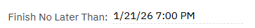 My thought is that since the work order was generated at 1/21/26 11:46am then the Finish No Later Than should be 1/22/26 11:46am, but the Finish No Later than seems to default to the database time. Our Database is in UTC so the Finish No Later than is 1/22/26 00:00. And the UI shows a date/time of 1/21/26 7:00 PM.