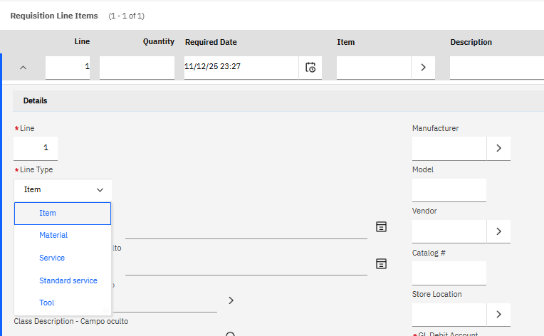 HI Craig, Thanks, I tried implementing a conditional expression to hide the "Standard Service" option and it works, however when I tried to do the same with the "Item" option the system send me this error when I try to add a new line in the Requisition Line Items.