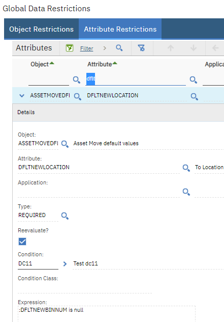 I tried your suggestion and when I set DFLTNEWBINNUM to be required in the conditional expression, I'm receiving the following error when adding the condition to the ASSET.NEWLOCATION attribute:
