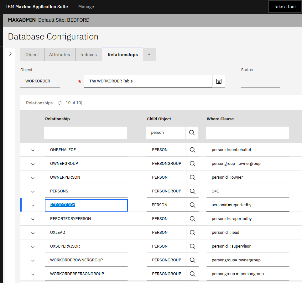 In WORKORDER, REPORTEDBY is a relationship with person table. Then, PRIMARYEMAIL is another relationship with EMAIL table. At the end, emailaddress is the field that you need.
