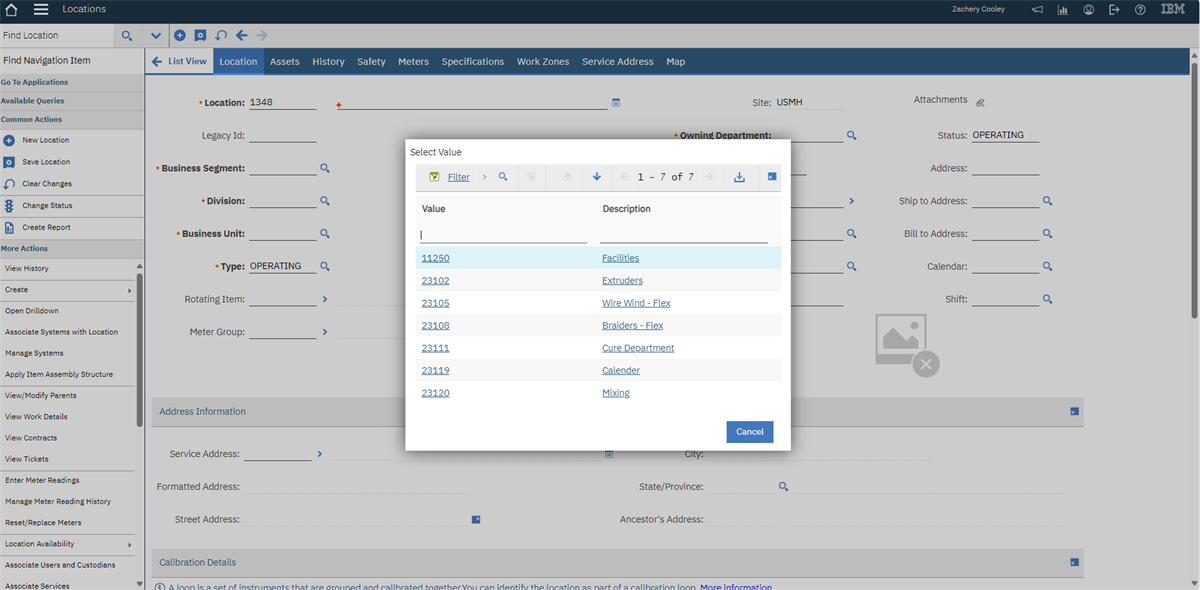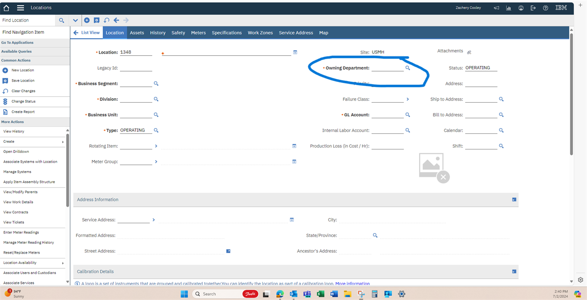 I'm attempting to add a new location in Maximo, but I can't figure out how to add an owning department. Pictures attached for reference.