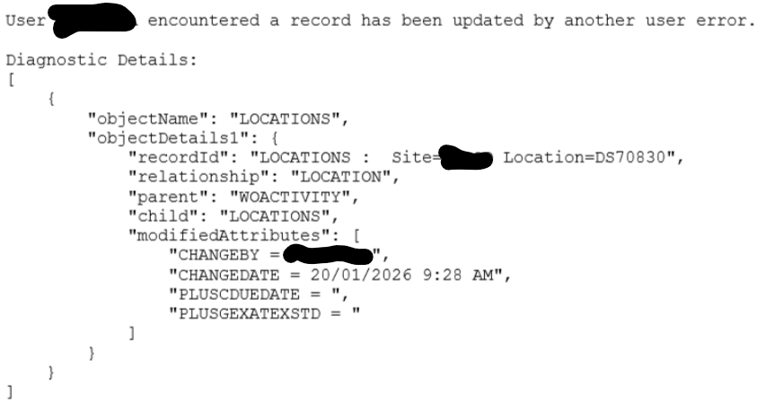 Seeking your assistance to provide ideas or solutions on how to resolve this issue. Whenever I generate a work order from Preventive Maintenance or try to close a work order, I keep receiving the error message: "Has been updated by another user." Our Maximo version is 7.6.1.3