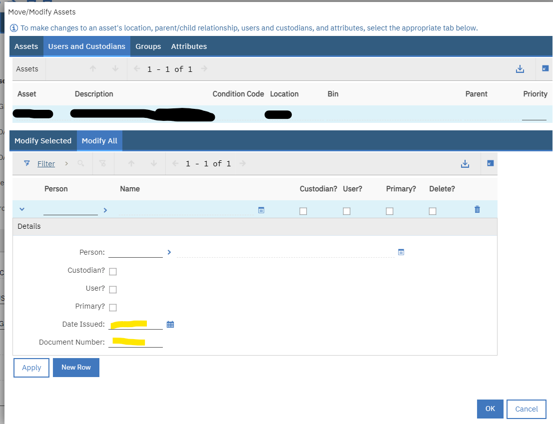 Dialog is located in Application ASSET, click on Move/Modify Asset, Select tab Users and Custodians and finally Modify All.