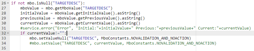 The script will get launched every time I generate work order from the PM with the Route. And with Line #31 not being commented out I can see that initialValue and previousValue are both null, but currentValue is the correct value we want to cross over from "Route Stop Description" by our previously created cross over domain database configuration):