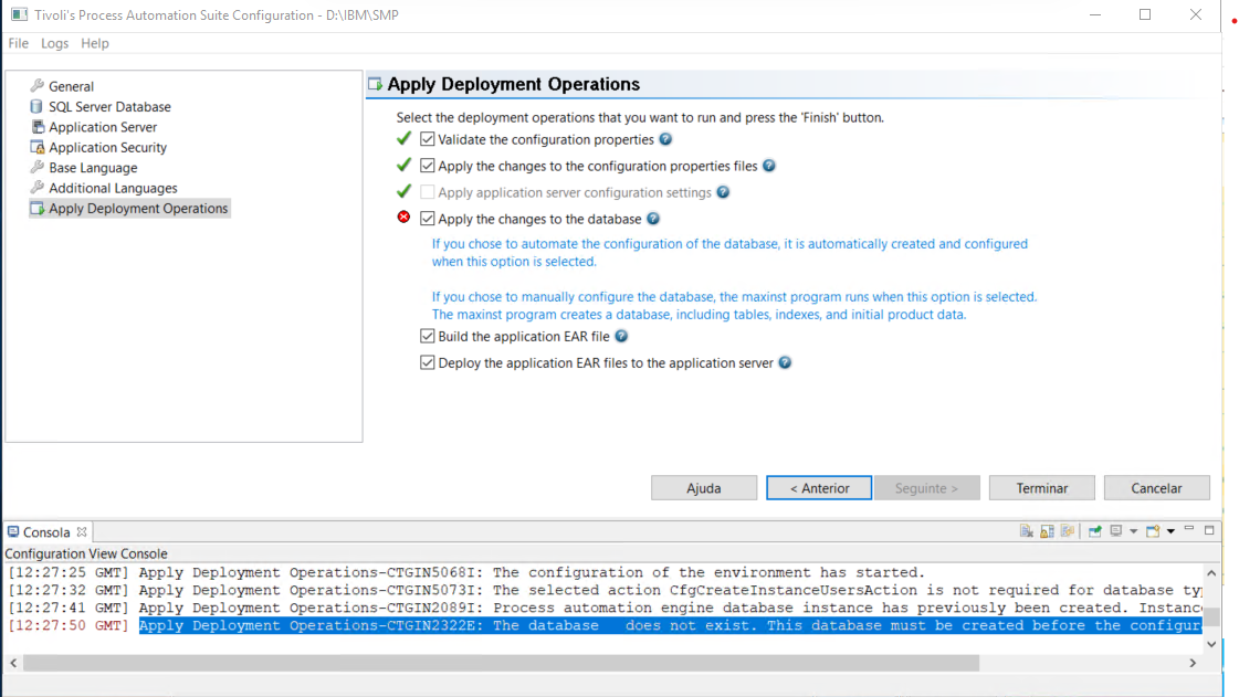 In the Tivoli's process Automation Suite Configuration; when I get to the Apply Deployment operations in the point - Apply the changes to the database as you can see in picture bellow.