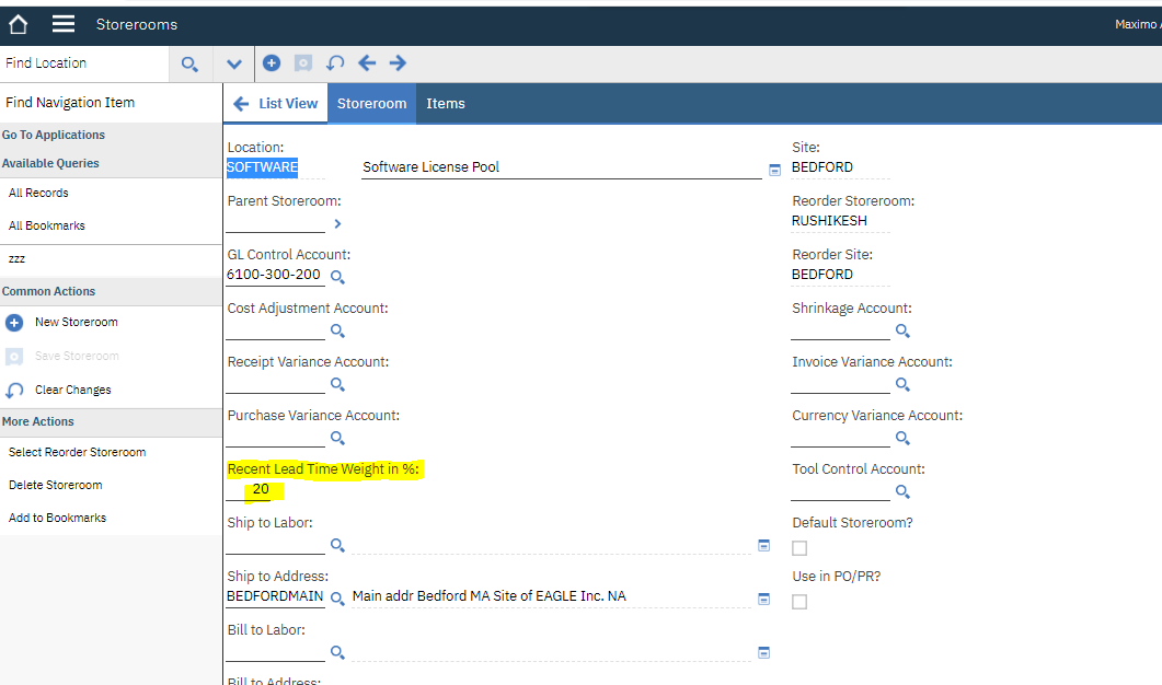 2. An important parameter present in the storeroom application which plays a key role in calculating the lead time value. That field name is Recent Lead Time Weight expressed in percentage(%) on Storeroom application as shown below. The Recent Lead Time Weight in % calculation shown above operates on 1 receipt at a time, in sequential order of the receipts.