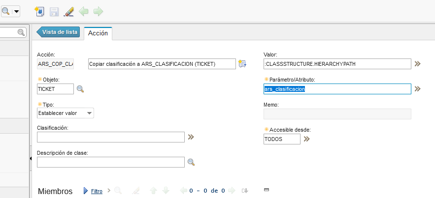 Then they execute an action of the type "set value" and in the value define it has loaded ":CLASSSTRUCTURE.HIERARCHYPATH" and in parameter/attribute it has loaded ars_clasificacion. In this way, when the escalation is executed, it updates the ars_clasificacion that you can then use to export to excel or report, etc. Can it be improved? Yes, with a script... but they solved it here (I didn't do this... it's very old).